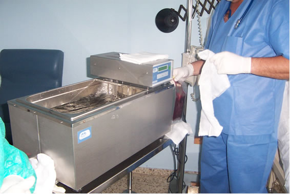 8.- DESCONGELACIÓN E INFUSIÓN. Las bolsas de progenitores se introducen en un baño con agua a 37º y una vez descongeladas y preparadas, son transfundidas por vía intravenosa.